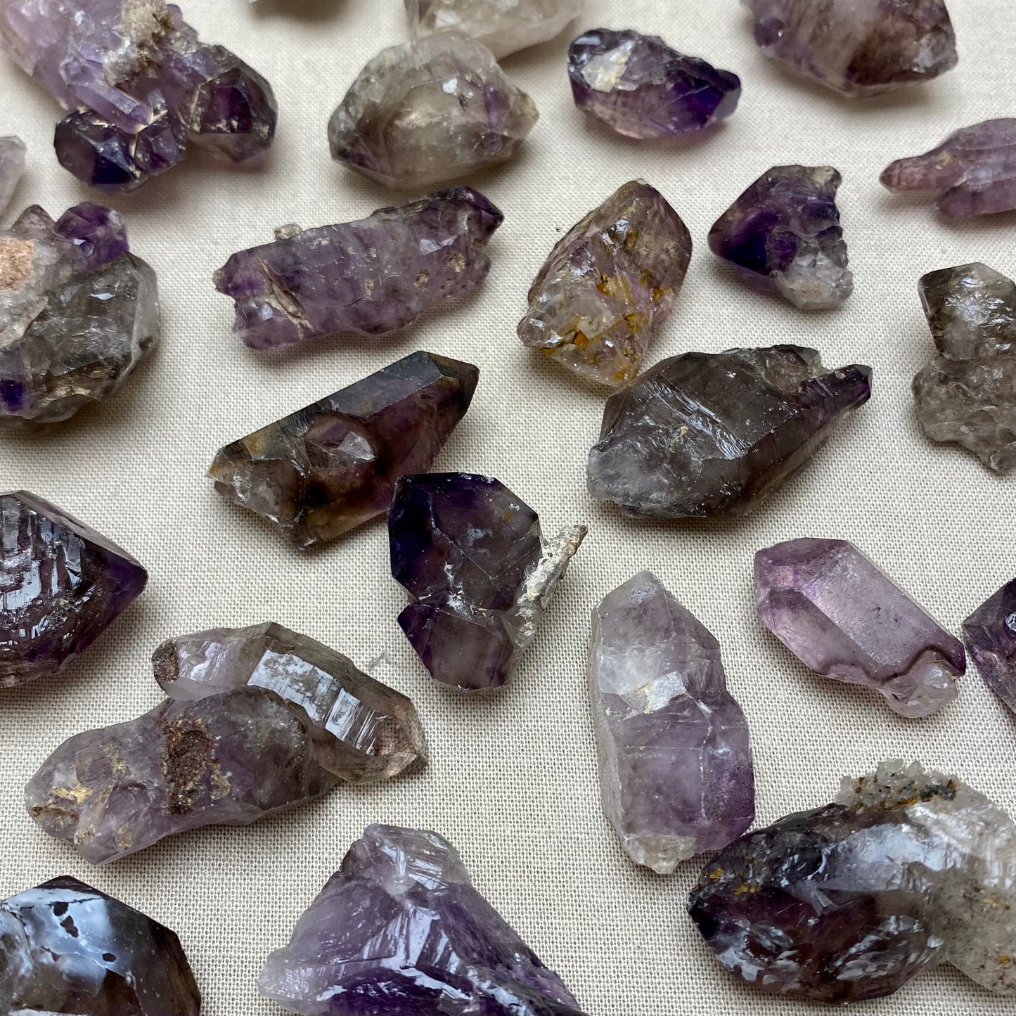 Dette er vidunderlige små røgfyldte ametyster stykker fra Chiredzi i Zimbabwe. De er lige som da de blive fundet.