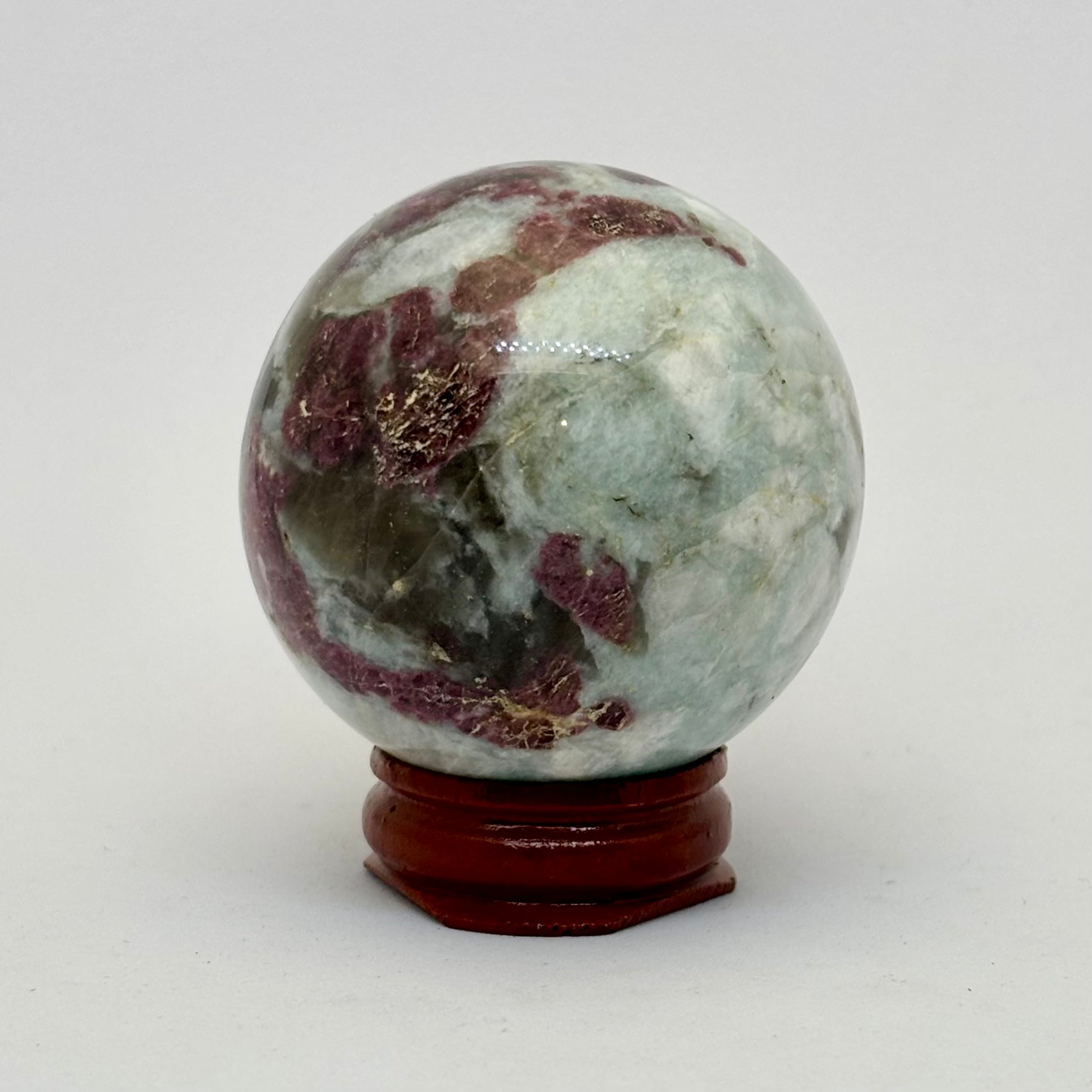 Denne smukke krystalkugle er lavet af rubelit som er pink turmalin i hvid kvarts. Den kan let bringe et strejf af magi til ethvert rum.
