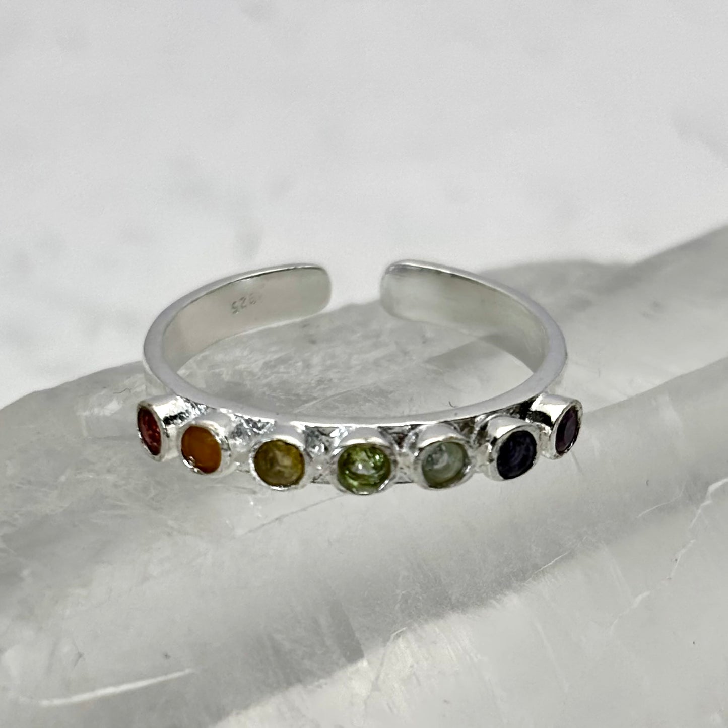 Køb seven chakra fingerring | 925 sterling sølv og krystaller i den lille krystalbutik i Valby