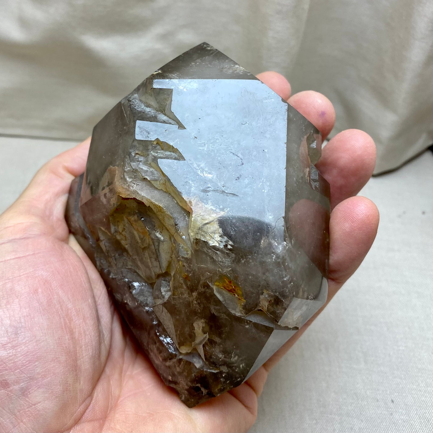Her er en meget interessant og meget stor poleret Røgkvarts. Et helt Ubeskriveligt dobbelttermineret væsen med en lille twillingespids