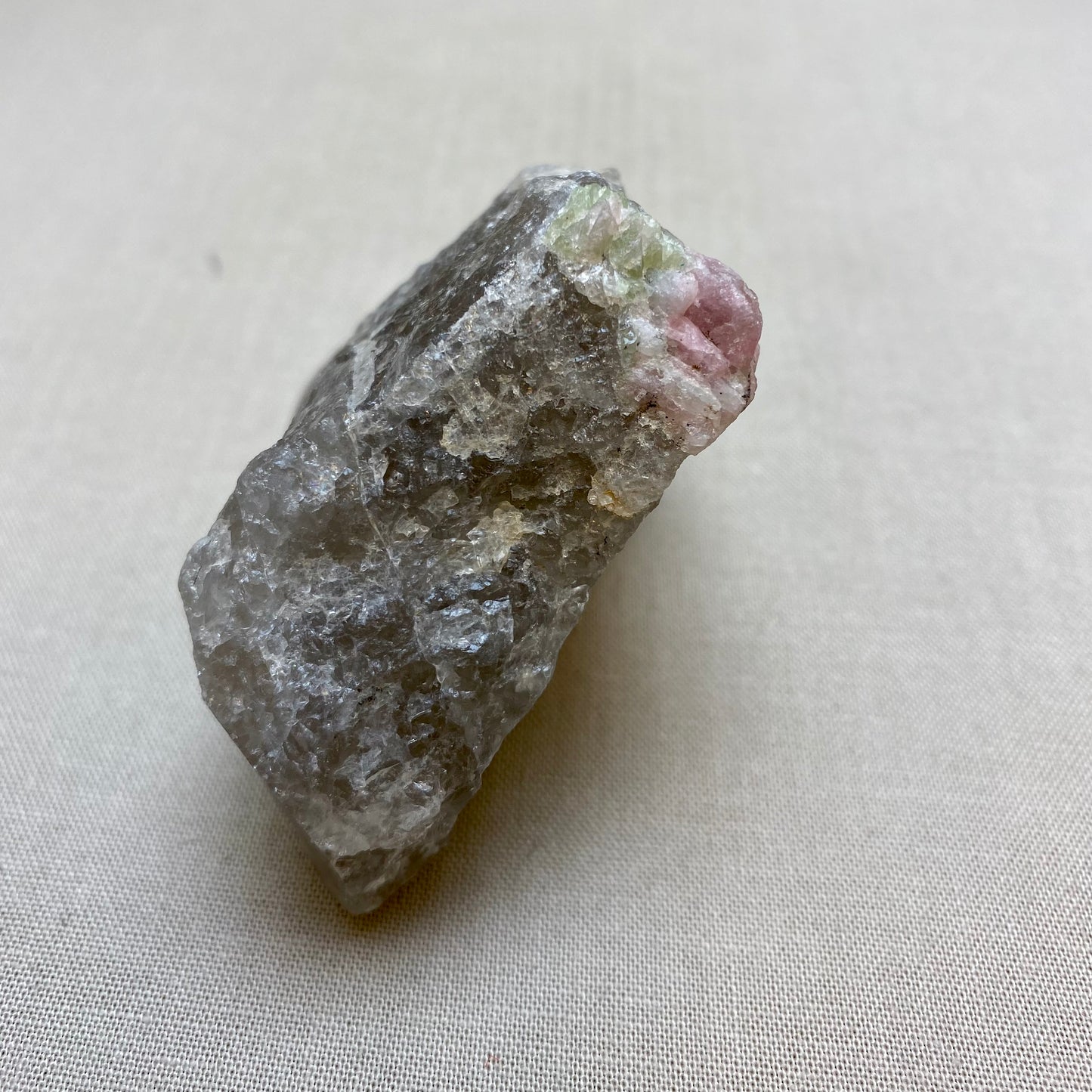 Her er stykke kvarts med en særlig Vandmelonturmalin fra Mozambique. Vidunderlige farver. Et fint og sjældent fund. Selvfølgelig ikke af ædelstenkvalitet men derfor også til at betale.
