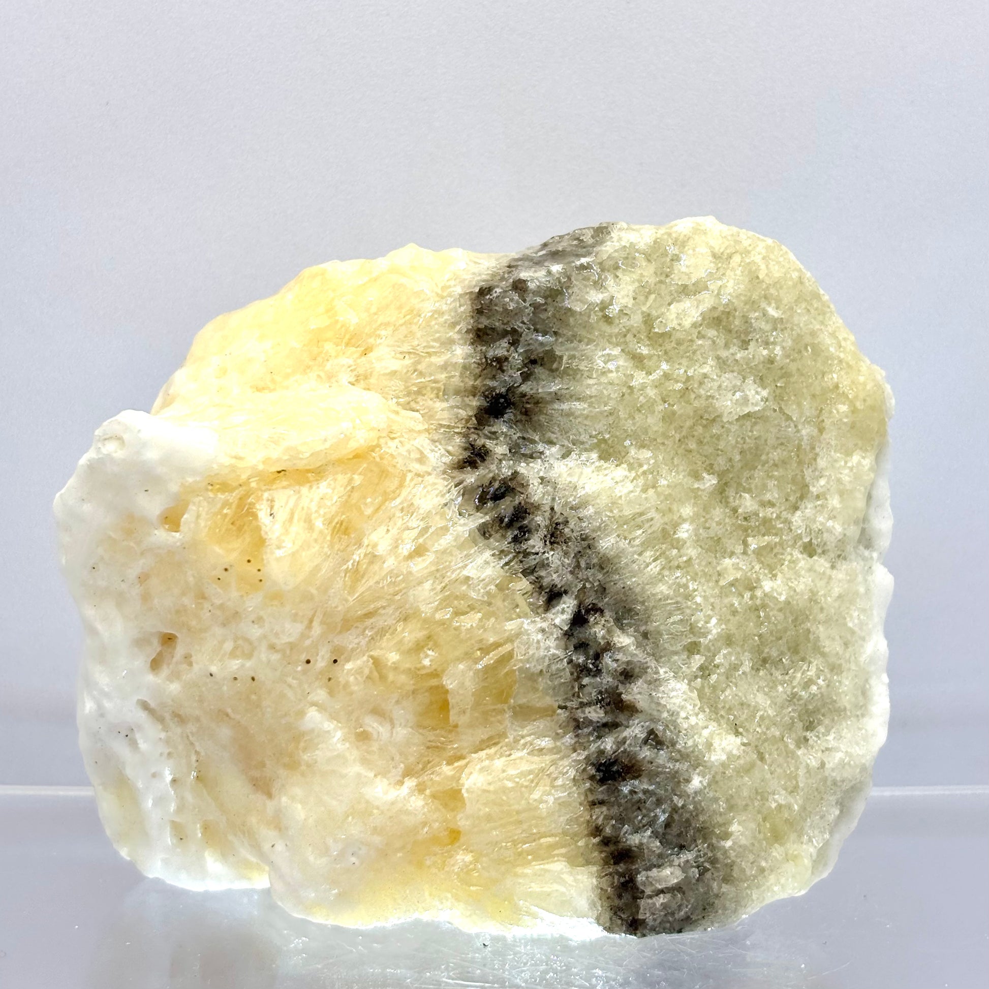 Zebra calcit er unikt med sine skiftende striber af creme hvid og grå/sort næsten sølv. Blankt og smukt i sin naturlighed.