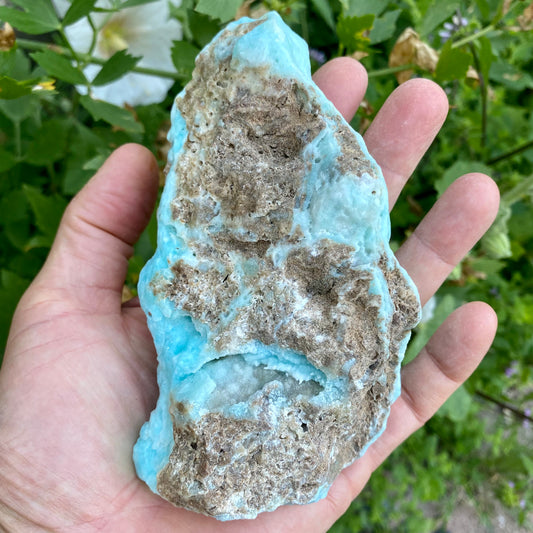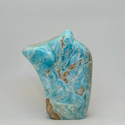 Blå aragonit er en smuk, himmelblå sten, der ofte har en silkeblød eller glasagtig overflade og en naturlig båndet struktur. Den dannes naturligt i kalkstenaflejringer og er kendt for sin beroligende og opløftende energi. Blå aragonit symboliserer ro, kommunikation og følelsesmæssig healing og er en favorit blandt dem, der søger en blid og nærende energi.