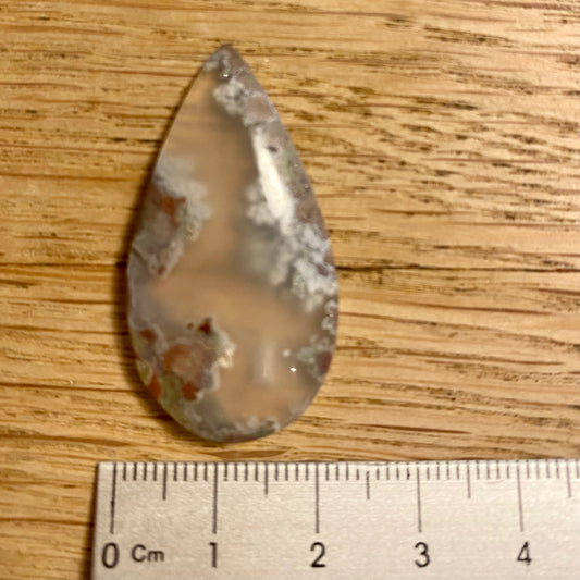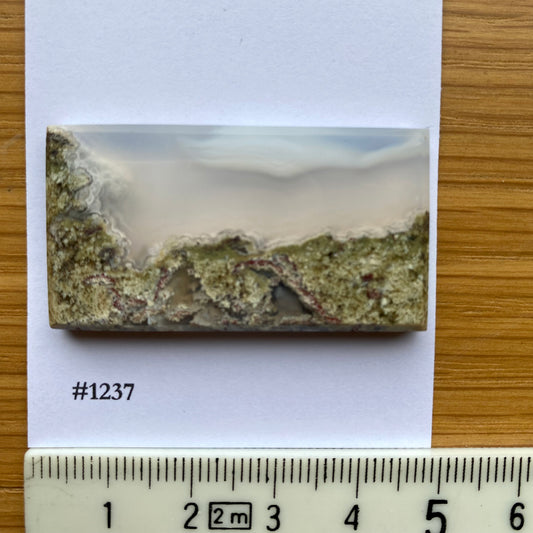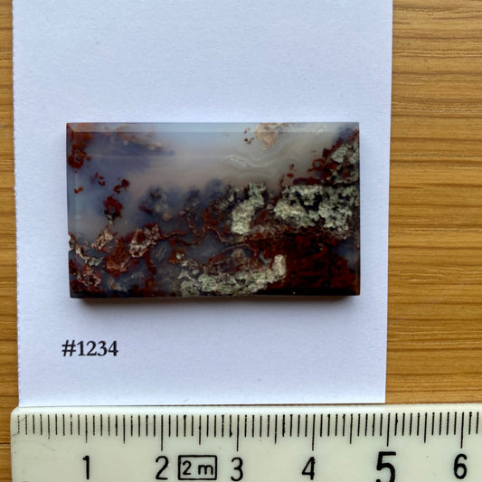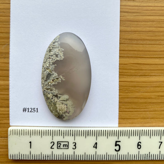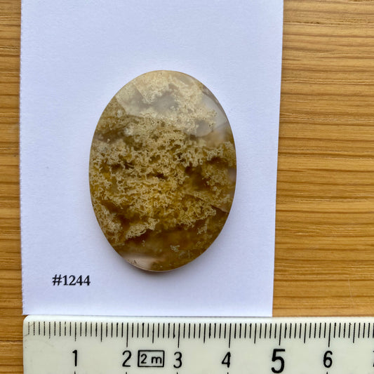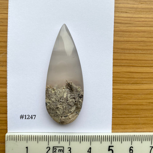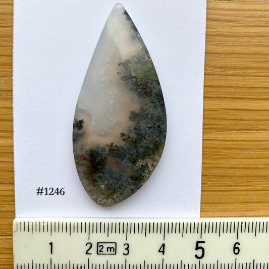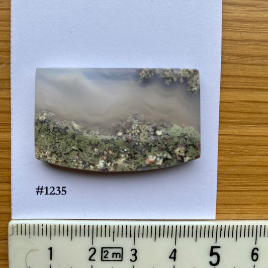 På Java i Indonesien har de tradition for at skære mos agater i tynde skiver. Når de er heldige finder de udsøgte og eventyrlige landskaber som de polerer op til eksempler som dette. Det er dygtige kunstnere der kan se hvordan agaten skal skæres for at frembringe landskaberne. Mos agater som disse er ved at blive til samlerobjekter, da de hver især er helt unikke og fortæller deres helt særlige eventyr.