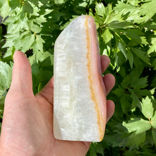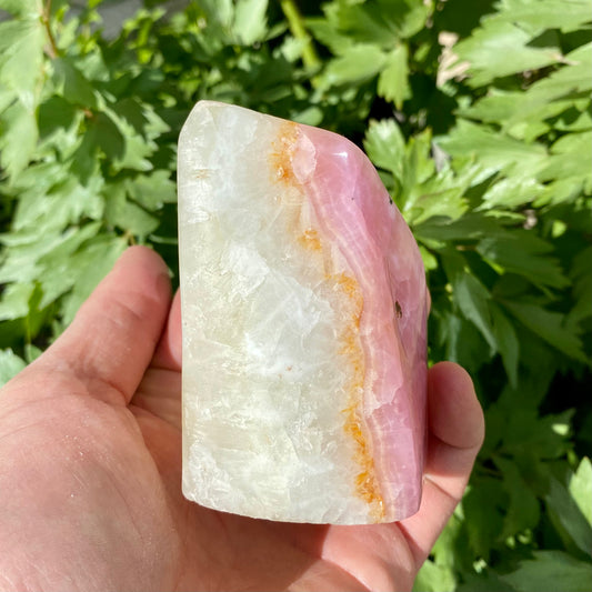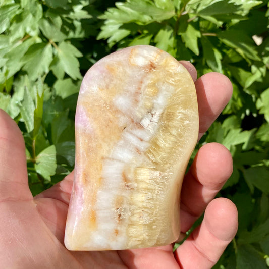 Pink aragonit fra Afghanistan er en sjælden og smuk sten, der udmærker sig ved sine blide rosa nuancer, ofte med hvide eller beige bånd, der giver stenen et marmorlignende udseende. Den er en variant af aragonit, der dannes naturligt i kalkaflejringer. Denne sten symboliserer kærlighed, balance og følelsesmæssig healing og er værdsat for sin rolige og nærende energi.