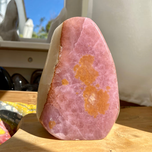 Pink aragonit er en sart sten og bør ikke udsættes for vand, da det kan beskadige dens overflade. Rens den i stedet forsigtigt med en tør, blød klud. For energirensning kan du bruge røgelse som salvie eller palo santo, placere den i måneskin natten over, eller lade den hvile på en selenitplade. Undgå skrap behandling eller udsættelse for kemikalier for at bevare dens naturlige skønhed.